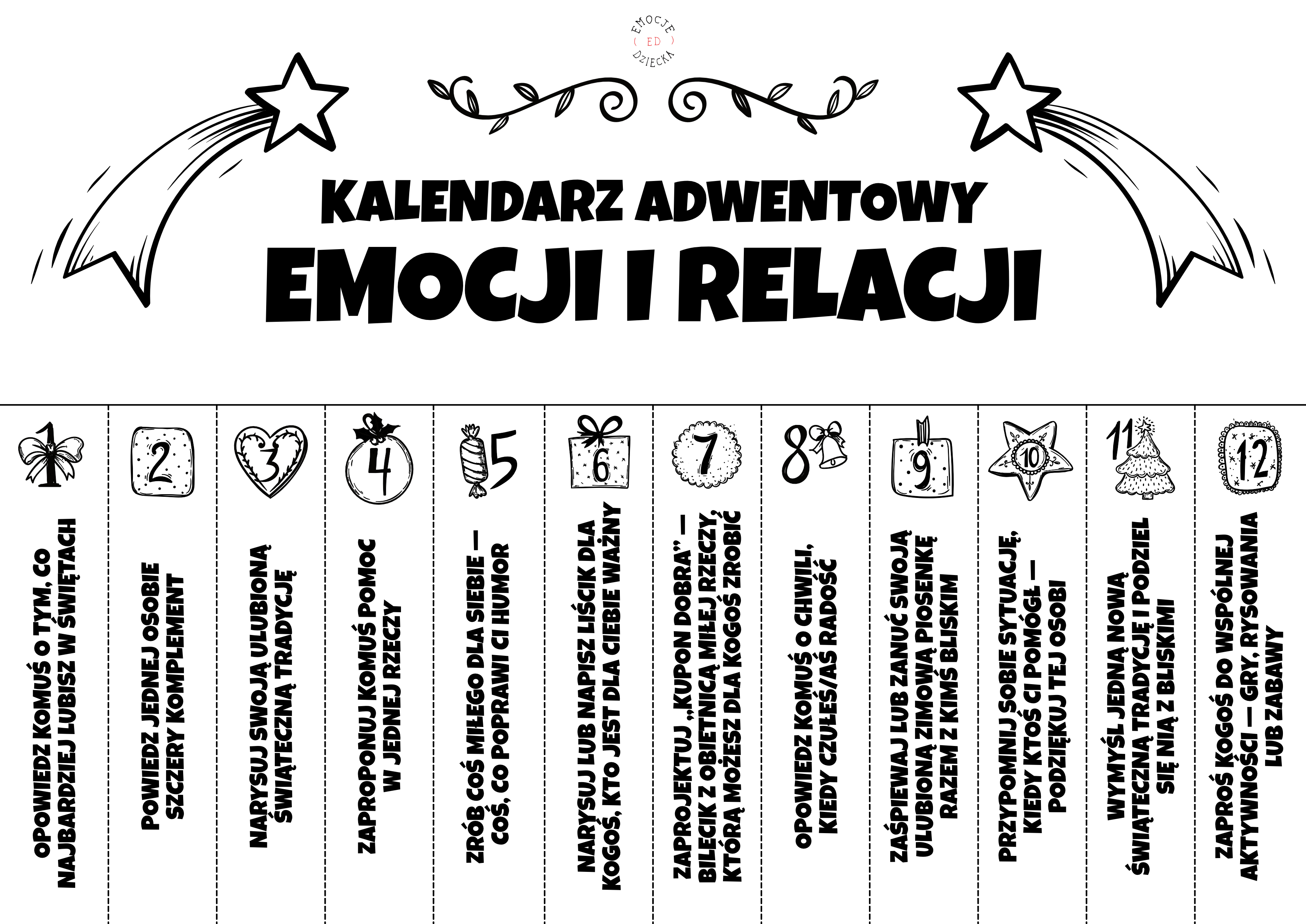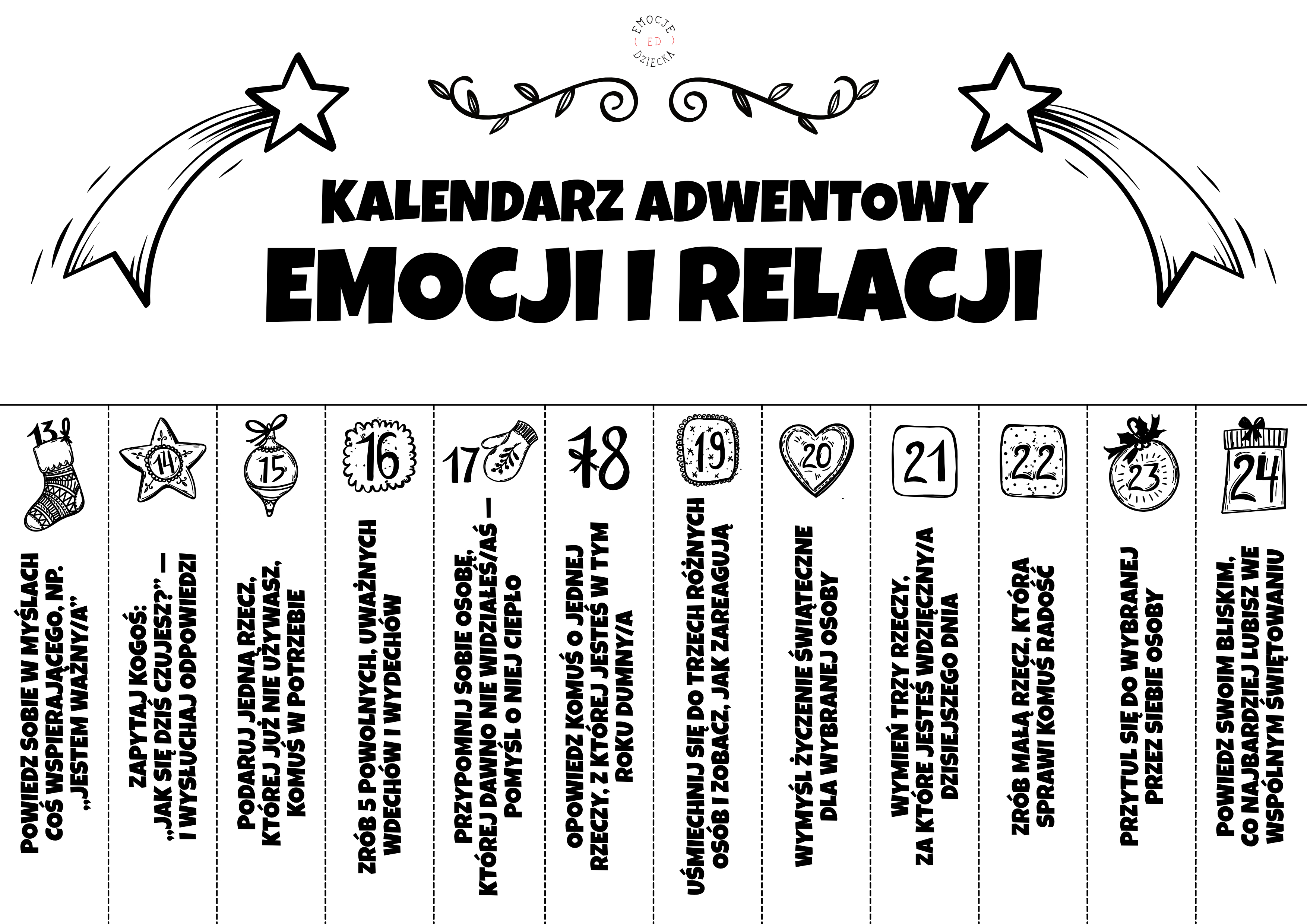 Grudzień ma w sobie coś wyjątkowego. Zwalnia nas, zatrzymuje na chwilę, trochę wzrusza, trochę otula. W gabinecie często mówię rodzicom, że dzieci nie potrzebują wielkich prezentów, tylko małych, powtarzalnych gestów, które tworzą poczucie bezpieczeństwa. I właśnie z takiej potrzeby powstał Kalendarz Adwentowy Emocji i Relacji — prosty, codzienny sposób na wprowadzenie do grudniowej codzienności odrobiny uważności i dobrych słów.