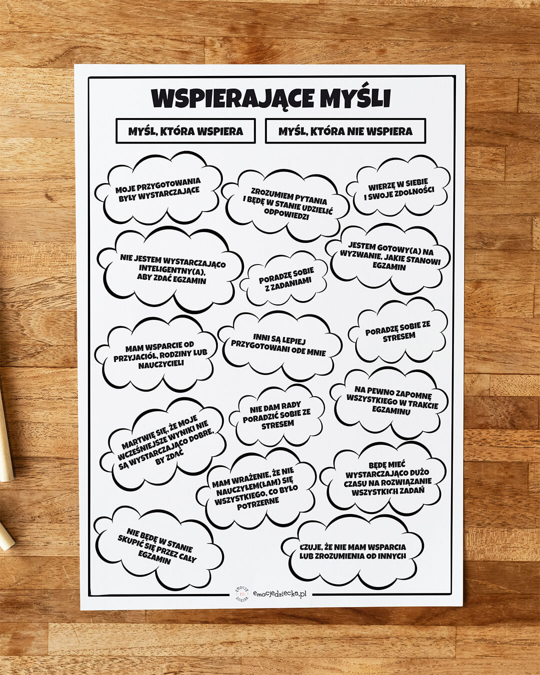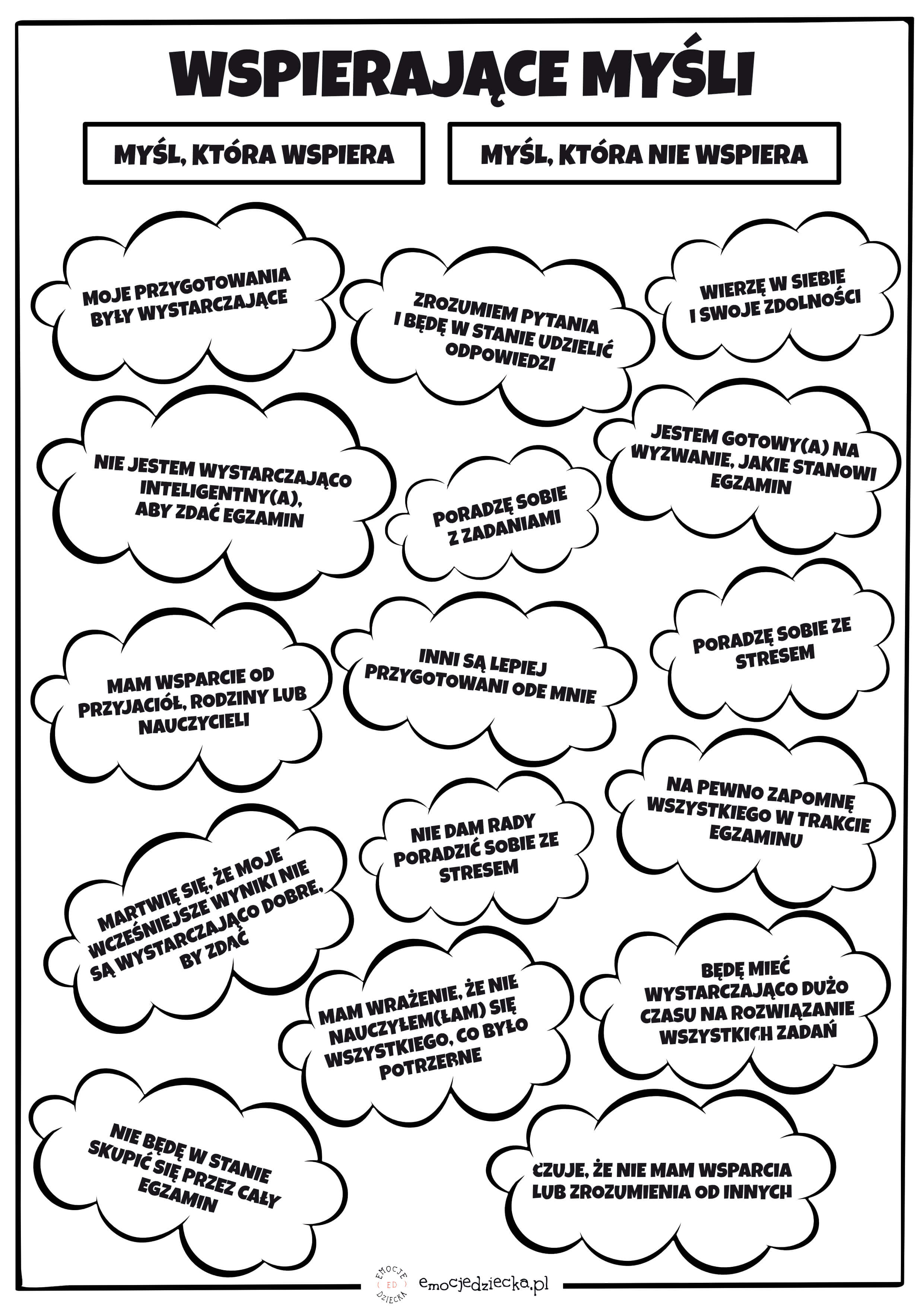 Właśnie z myślą o pracy z tym tematem dzielę się bezpłatną kartą pracy „Wspierające myśli”, która pochodzi z zestawu „Będę zdawać egzamin” i którą możesz pobrać oraz wykorzystać w swojej pracy z dziećmi, młodzieżą lub dorosłymi.